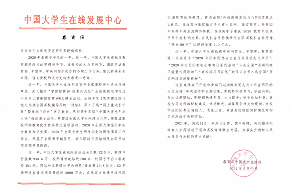 2月1日,教育部中國大學生在線向我校黨委常委、宣傳部長王曉梅和我校學生工作部(學生處)發來感謝信。信中表示,2020年是極不平凡的一年。這一年,中國大學生在線在教育部思政司的堅強領導下,在齊齊哈爾大學的大力支持下,圓滿完成教育部、中宣部、中央網信辦交辦的各項工作任務。值此新春到來之際,謹向齊齊哈爾大學的大力支持表示衷心感謝。