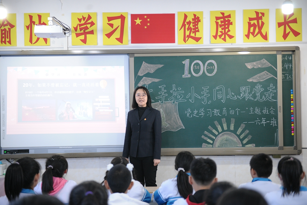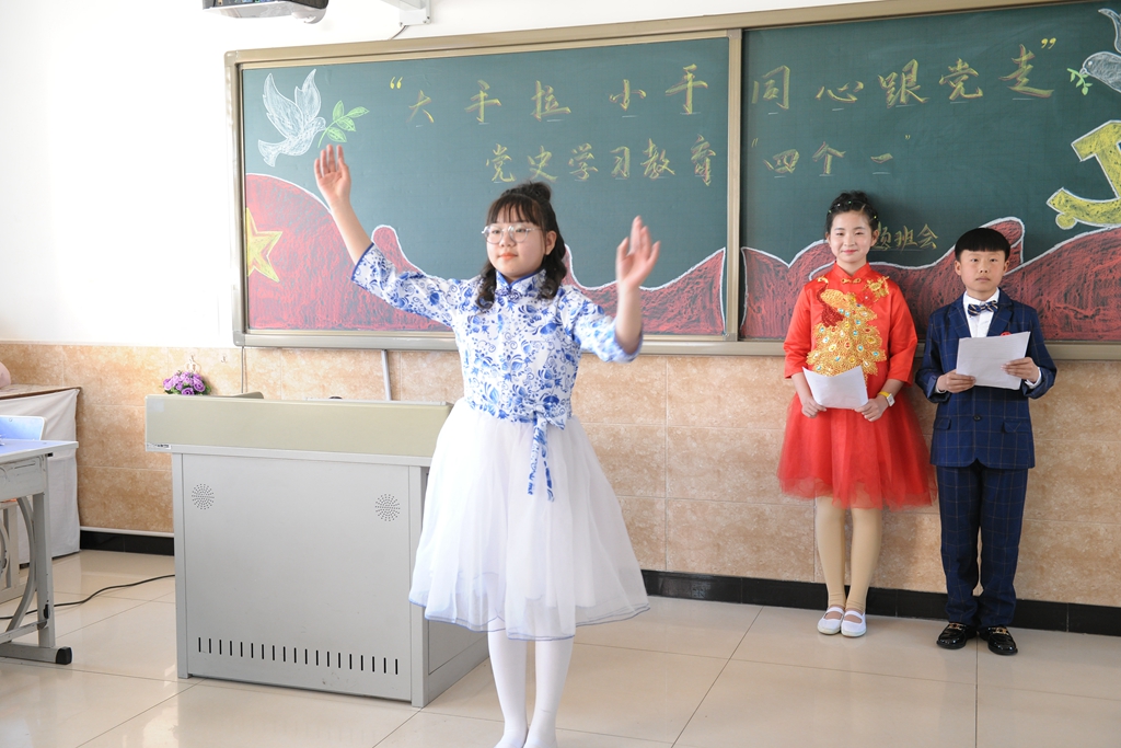 “大手拉小手,同心跟黨走”黨史學習教育“四個一”主題班會以符合中小學生年齡特點與認知經驗為前提,采用寓教于樂的多樣體驗,設計了四個“一”的主題:演唱一支黨的贊歌——各班同學們合唱了《沒有共產黨就沒有新中國》《閃閃紅星》《中國少年先鋒隊隊歌》《少年心中國夢》等歌曲,大家以氣勢磅礴、鏗鏘有力的歌聲抒發對黨、對祖國的熱愛;講述一個黨的故事——青年教師講述了《一生正氣,一門正義夏明翰的故事》《肖永正的故事》《半條被子》《周恩來的故事》等黨史中的經典故事,六合中心校的同學們講述了《王二小的故事》《葉挺的故事》《抗日小英雄海娃的故事》《過年》等黨史故事,師生們在一個個黨史故事中一起追尋紅色記憶,感受中國共產黨成長壯大的曲折歷程;朗誦一首黨的詩歌——青年教師和同學們一起朗誦了經典詩歌《親愛的祖國》《百年輝煌》《黨的贊歌》《黨啊,我親愛的黨!》,將紅色種子厚植在學生心田,讓紅色基因在這里傳承發揚;寫一封給黨的書信——在青年教師的引導下,全體學生以“紙”為媒,給黨寫了一封書信,對象有的是英雄烈士,有的是領袖人物,部分同學還朗讀了書信,表達了同學們對黨的熱愛和對美好未來的憧憬之情。