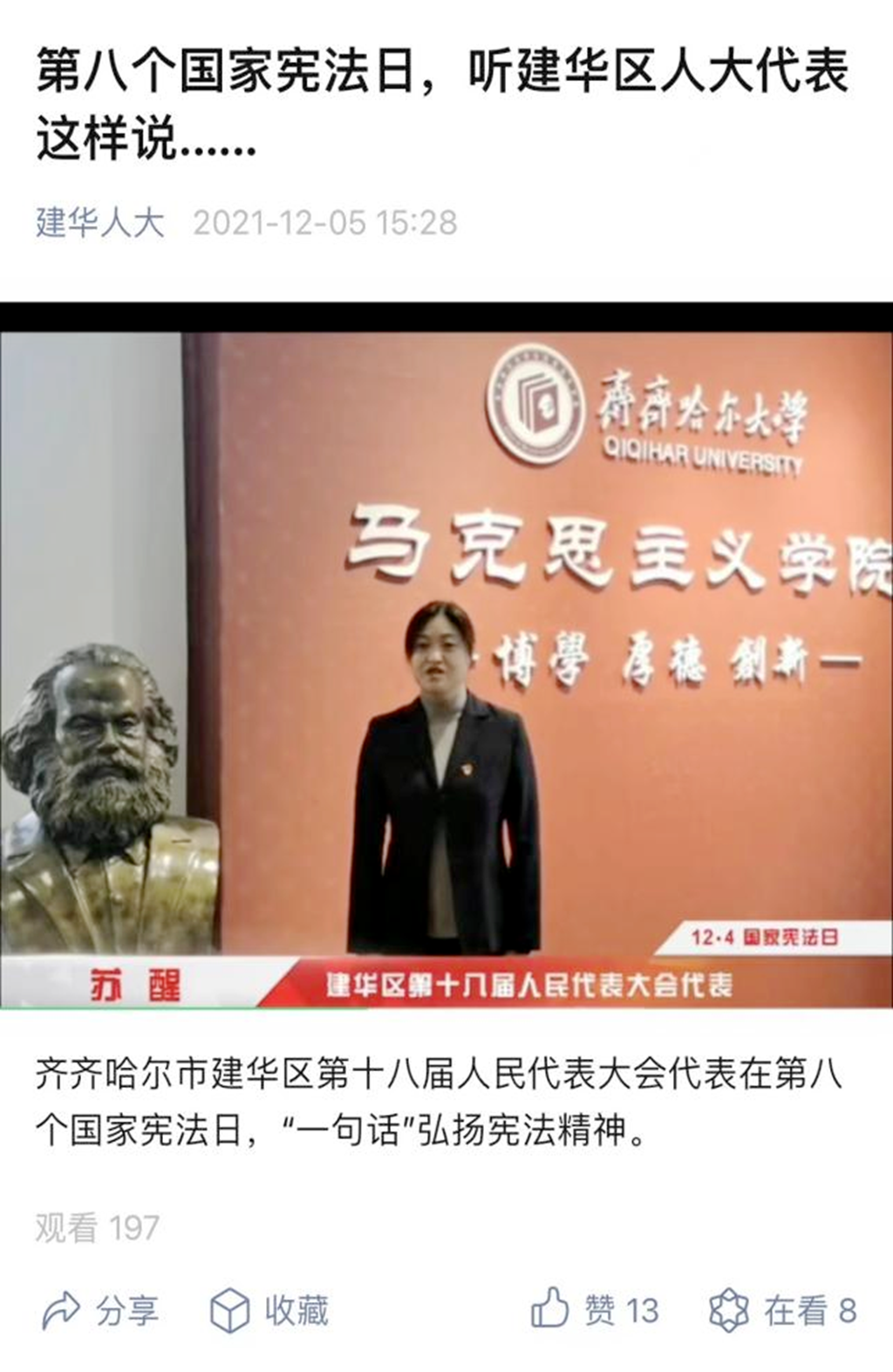 馬克思主義學院黨委書記蘇醒作為建華區(qū)人大代表,帶頭學習習近平法治思想,積極進行“國家憲法日”宣傳。