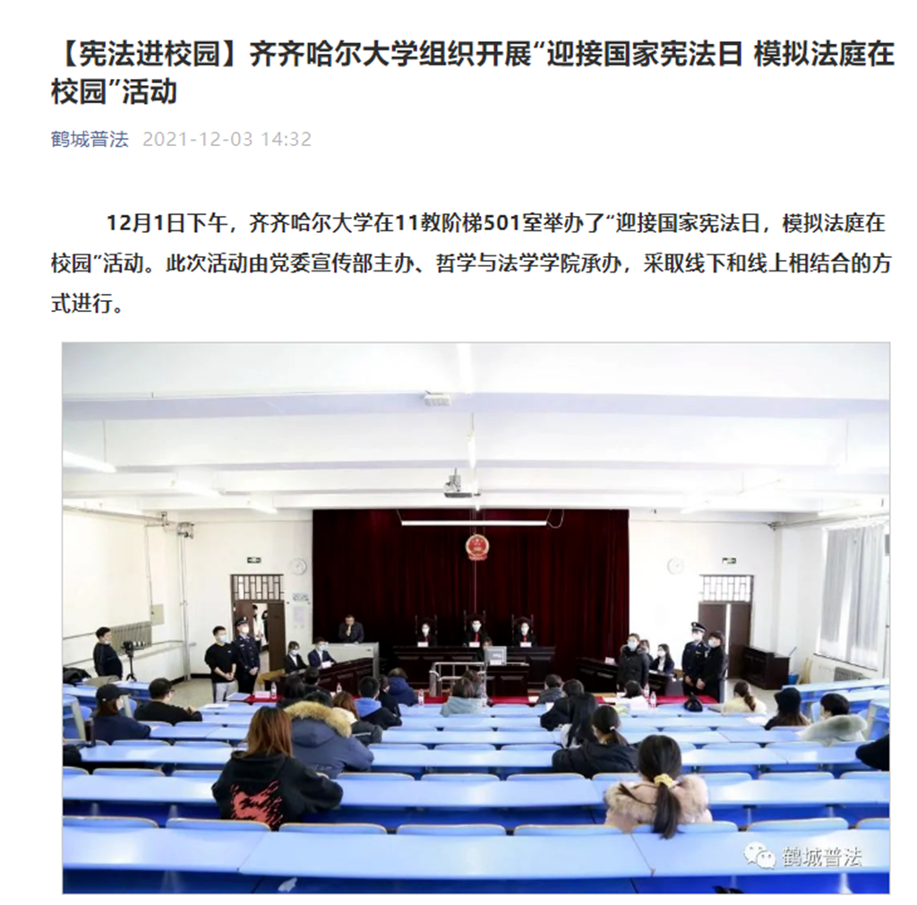 久久為功,馳而不息。堅持不懈開展“模擬法庭”實踐活動是我校特色鮮明的常態(tài)化法治宣傳教育活動。哲學與法學學院利用法學學科專業(yè)優(yōu)勢,結合教學內容,不斷總結經(jīng)驗,持續(xù)打造“模擬法庭”精品活動,在學校法治宣傳教育活動中發(fā)揮了典型示范的作用。12月1日,校黨委副書記齊宏偉,校黨委常委、宣傳部長王曉梅,哲學與法學學院黨委書記于春梅,宣傳部副部長何強,哲學與法學學院副院長苗繪等與師生代表一起參加了以真實案例改編的“幫助信息網(wǎng)絡犯罪案”的模擬法庭庭審活動。以線下和線上相結合的方式,以案說法全程直播,在嚴密的法律程序和莊重嚴肅的法庭氣氛中,讓師生身臨其境感受法治權威。融專業(yè)性、知識性、教育性、警示性為一體,提高學生法治意識,增強法治觀念引導學生知法明理。12月3日,齊齊哈爾市司法局“鶴城普法”微信公眾號作了報道。