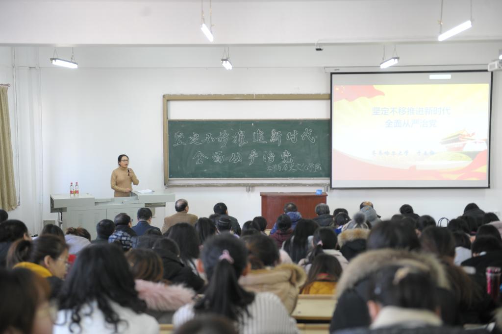在東區25教階梯301教室,校黨的十九大精神宣講團成員、馬克思主義學院副院長、碩士生導師于春梅教授以《堅定不移推進新時代全面從嚴治黨》為題,從充分認識五年來全面從嚴治黨的重大成就、明確新時代全面從嚴治黨的總體要求、全面把握黨的十九大對新時代全面從嚴治黨的新部署等方面,對黨的十九大精神進行了系統、全面、深入的講解。于春梅指出,中國特色社會主義進入新時代,面臨新環境新挑戰新問題,打鐵必須自身硬,因此必須堅定不移推進新時代全面從嚴治黨這一偉大工程,必須進一步把我們黨建設好、建設強,使我們黨成為堅強有力的領導力量,從而決勝全面建成小康社會、奪取新時代中國特色社會主義偉大勝利。文學與歷史文化學院全體教職工、學生黨員及入黨積極分子參加了宣講活動。