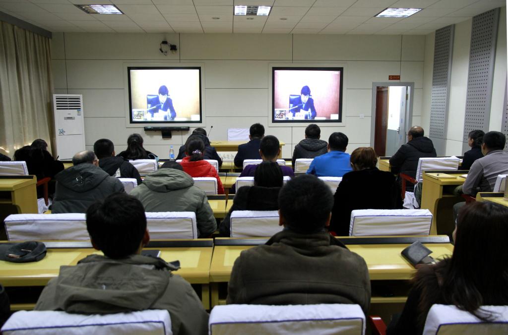 我校在西區主樓六樓遠程視頻會議室設立分會場,校黨委書記蘭景力、副校長王剛以及宣傳統戰部、學生處、團委、招生就業處、研究生部、學院主管就業工作領導、2018屆畢業生輔導員在分會場集體收聽收看了視頻會議。