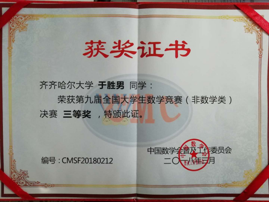 據了解,參加本次競賽的非數學專業組有216名,是從全國29個賽區的非數學專業組85482名學生中選拔出來的,于勝男在黑龍江賽區脫穎而出,作為黑龍江賽區8名參賽學生之一參加了本次競賽。