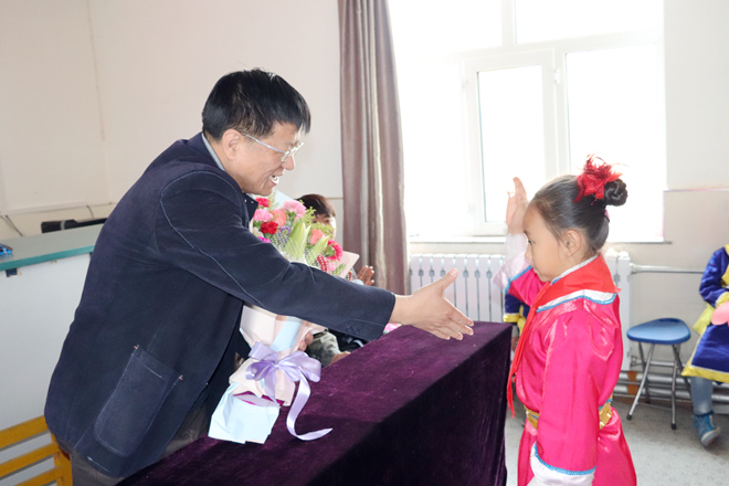 上午10點30分,捐資助學活動正式開始,哈拉達小學對我校師生的到來表示熱烈歡迎以及衷心感謝,并以視頻的形式回顧了這二十年來“鴻雁工程”與哈拉達小學建立的深厚情義。哈拉達小學的學生代表特意向“鴻雁工程”發起人之一的楊淳老師獻花來表示這二十年來他對“鴻雁工程”所付出的辛勞汗水與做出的巨大貢獻。