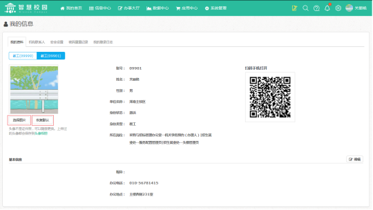 2.在我的資料頁(yè)面,您可以查看您的個(gè)人頭像,可以選擇上傳新的頭像,也可以將當(dāng)前頭像恢復(fù)至最開(kāi)始的一卡通版本,如下圖所示