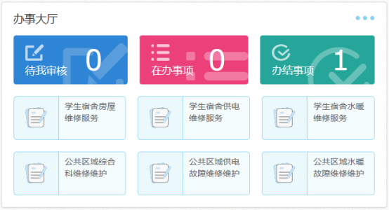 (1)點(diǎn)擊導(dǎo)航中辦事大廳后,會(huì)顯示出學(xué)校各部門(mén)提供的服務(wù)。