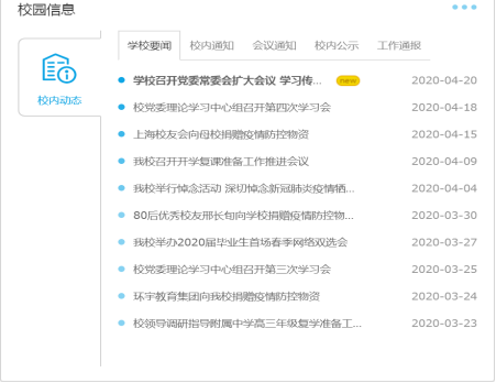 校園信息門(mén)戶(hù)集成了校園內(nèi)網(wǎng)的學(xué)校要聞、校內(nèi)通知、會(huì)議通知、校內(nèi)公示、工作通報(bào)等,與校內(nèi)網(wǎng)信息同步更新,確保用戶(hù)看到最新的校內(nèi)信息。各類(lèi)別以卡片的形式展現(xiàn),只要點(diǎn)擊相關(guān)卡片標(biāo)題,即可查看該類(lèi)別下面的信息。