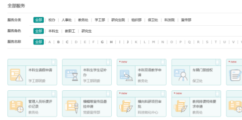 (1)點(diǎn)擊導(dǎo)航中“網(wǎng)上辦事大廳”后,會(huì)顯示出學(xué)校各部門(mén)提供的服務(wù)。