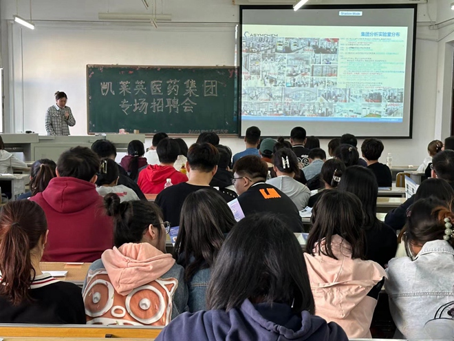 招聘會開始時,李陽首先介紹了集團,這讓我院學生了解到凱萊英醫藥集團是一家全球領先、技術驅動型的CDMO一站式綜合服務商。該集團為國內外的制藥公司、Biotech公司提供藥品全生命周期的一站式CMC服務、高效和高質量的研發與生產服務,加快創新藥的臨床研究與商業化應用。